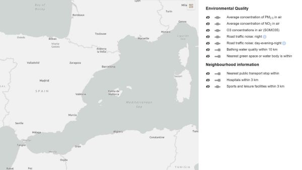 Los usuarios pueden obtener una visión general de la calidad ambiental del entorno en el que viven, trabajan o viajan, insertando una ubicación en el campo de dirección o seleccionándola en el atlas. Además, pueden obtener detalles adicionales sobre variables y umbrales utilizados.