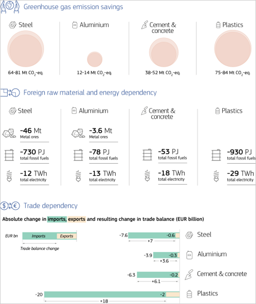El Centro Común de Investigación (JRC) de la Unión Europea ha publicado un informe que muestra cómo la economía circular puede reducir entre 189 y 231 millones de toneladas de CO₂ equivalente al año en sectores industriales de alta intensidad energética, como el acero, el aluminio, el cemento, el hormigón y el plástico. Estas industrias representan cerca del 15% de las emisiones totales de gases de efecto invernadero de la UE.