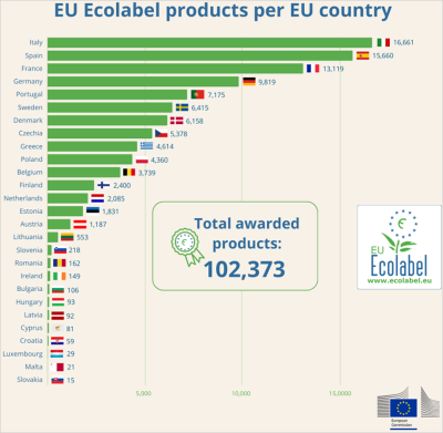 Las últimas cifras de productos y licencias certificadas por la etiqueta ecológica de la UE muestran una tendencia al alza constante en toda Europa, con Italia (16%), España (15%), Francia (13%) y Alemania (10%) a la cabeza.