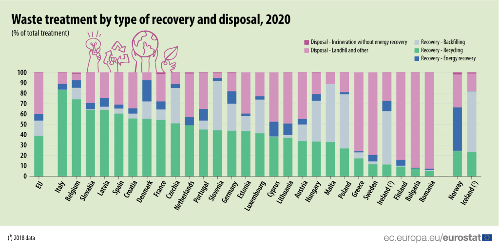 Se registraron tasas de reciclaje muy elevadas en Italia (83%), Bélgica (74%), Eslovaquia y Letonia (ambas con un 64%). Por otro lado, la eliminación en vertederos y otros fue la categoría de tratamiento predominante en países como Rumanía (93% en vertederos, 5% en reciclaje), Bulgaria (92% en vertederos, 8% en reciclaje) y Finlandia (84% en vertederos – 10% en reciclaje).