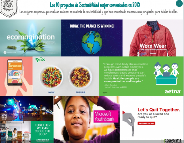 En la siguiente infografía realizada por Ecoavantis se resumen las 10 mejores campañas y proyectos de sostenibilidad realizados en 2015, según este informe: http://www.genial.ly/View/Index/56f2991d1561e80b5066a5a0