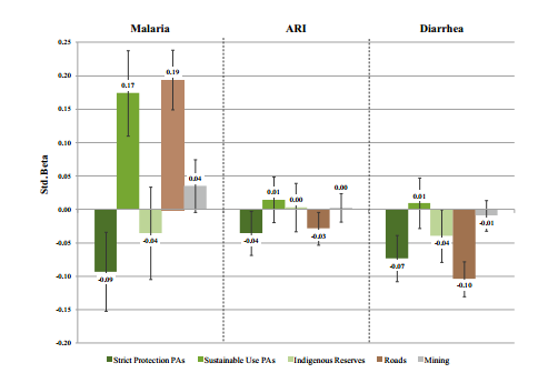 Pattanayak y su equipo vieron que la incidencia de la malaria, las infecciones respiratorias agudas y la diarrea fueron significativamente más bajas cerca de las áreas estrictamente protegidas como parques y otras reservas que conservan la biodiversidad y restringen fuertemente el uso humano. Por el contrario, la incidencia de la malaria fue mayor en áreas protegidas de ‘uso sostenible’ donde las personas pueden entrar y cosechar productos forestales.