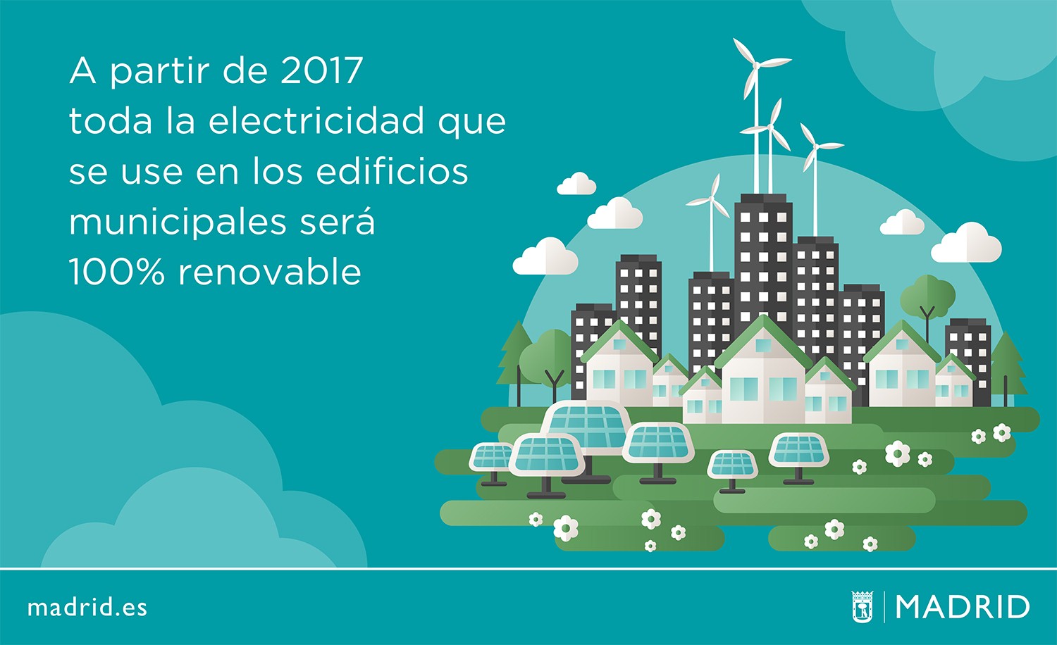 Desde el 1 de enero de 2017 toda la energía eléctrica proporcionada a los edificios e instalaciones municipales –tanto del propio Ayuntamiento como de sus organismos autónomos– será íntegramente de origen renovable. En este caso, una mezcla de hidráulica, eólica y solar.