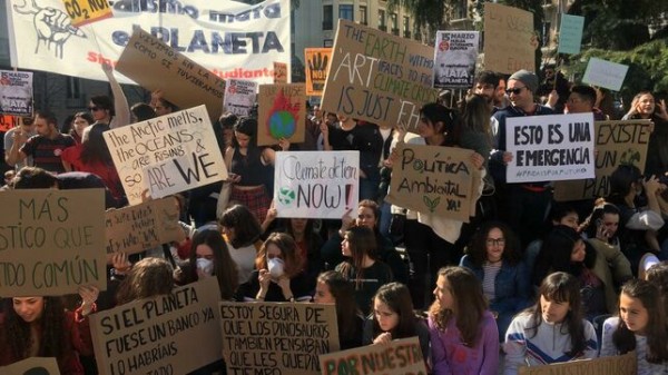 Juventud por el Clima publicó un manifiesto antes de las movilizaciones de este 1 de marzo en el que detallan «la posibilidad de que el nivel global del mar suba tres metros de aquí al año 2100 es real, el 74% del suelo español está en proceso de desertificación y se prevé que un 20% de lo que hoy está a salvo se vea en riesgo dentro de 50 años». «Nos encontramos en un momento clave de nuestra historia (…) Nos jugamos mucho, nos jugamos nuestro futuro», reza el texto. La manifestación del viernes en Madrid ha terminado entre ovaciones a la convocatoria del 15M y más gritos: «Para qué estamos estudiando si el planeta están quemando».