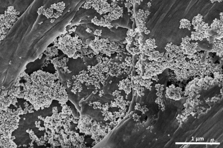 Investigadores del CSIC desarrollan un proceso verde y energéticamente eficiente para eliminar microplásticos provenientes de cosméticos del agua. Imagen captada por microscopía electrónica de barrido donde se ve las nanoflores de óxido de hierro sobre microplásticos. / ICMM Investigadores del Instituto de Ciencia de Materiales de Madrid del