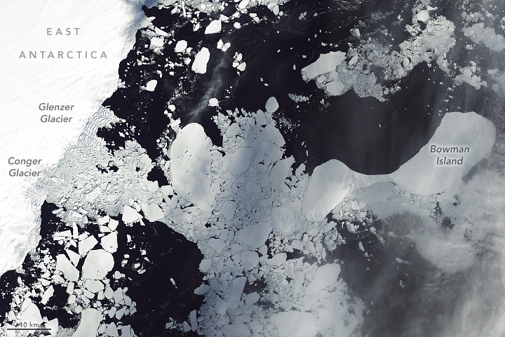 Una enorme plataforma de hielo de más de 1.200 kilómetros cuadrados se ha derrumbado en el glaciar Conger, al este de la Antártida, desintegrándose en miles de icebergs a la deriva que navegan a más de 60 kilómetros por hora en dirección oeste-noroeste, según el Centro Nacional del Hielo de EE.UU. (USNIC) con datos de la NASA.