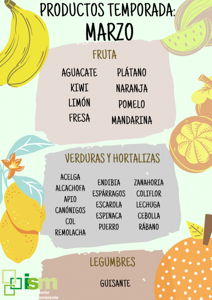 El mes de marzo continua con la tendencia de febrero: se mantienen los cítricos y casi todas las verduras consumidas durante el mes pasado. Sin embargo, este mes será la última oportunidad para disfrutar de determinadas frutas y verduras, pues con la llegada de la primavera y por lo tanto, la subida de las temperaturas, se finalizan algunos procesos de maduración.