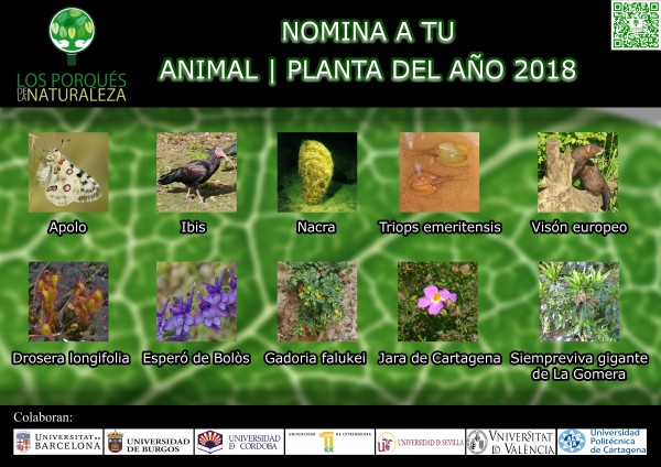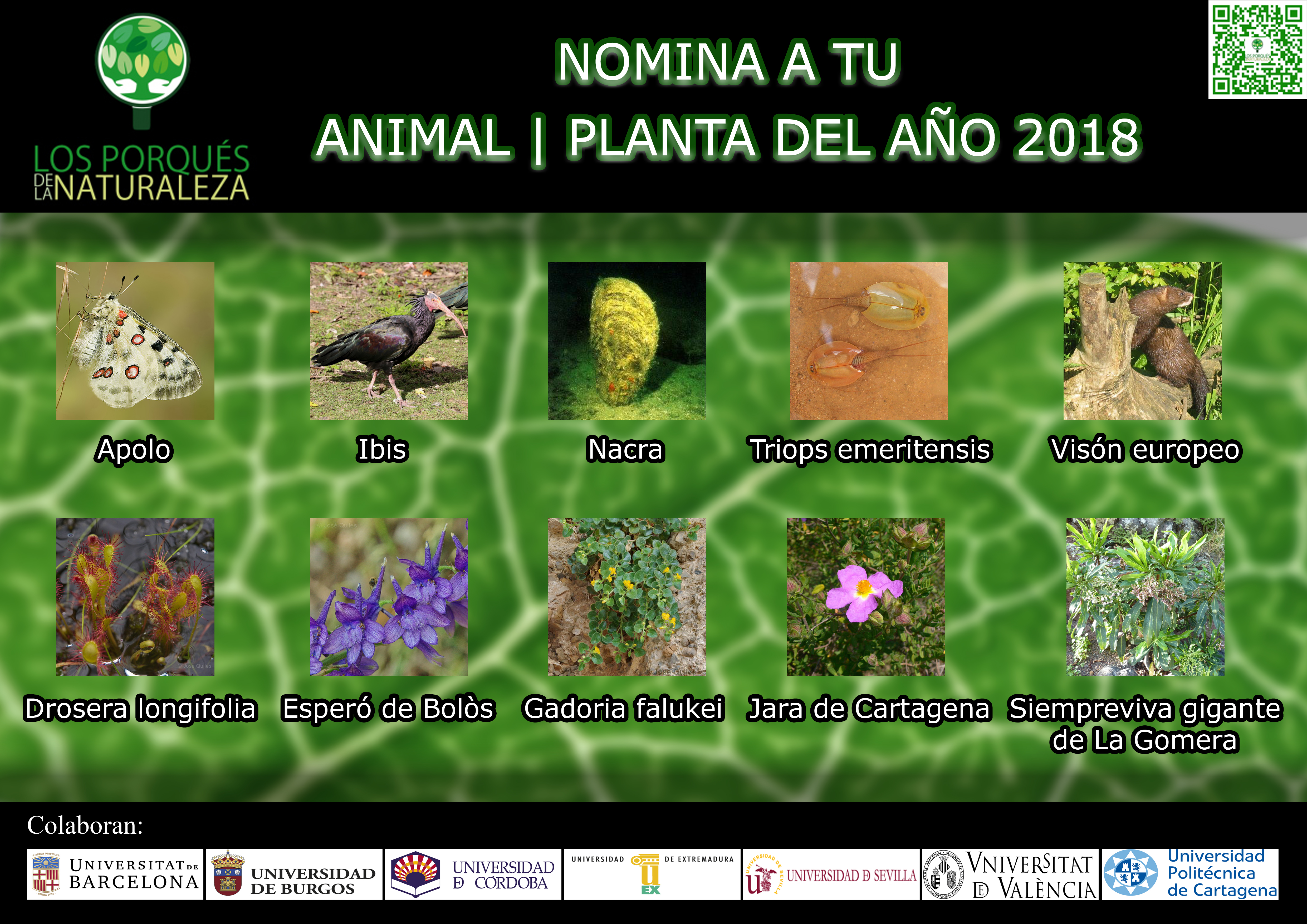 En total, los nominados al Animal | Planta del Año 2018 son los siguientes: mariposa apolo (por parte de la Universidad de Valencia), ibis eremita y siempreviva gigante de La Gomera (por parte de la Universidad de Córdoba), nacra y esperó de Bolòs (por parte de la Universitat de Barcelona), Triops emeritensis (por parte de la Universidad de Extremadura), visón europeo y Drosera longifolia (por parte de la Universidad de Burgos), Gadoria falukei (por parte de la Universidad de Sevilla) y jara de Cartagena (por parte de la Universidad Politécnica de Cartagena).