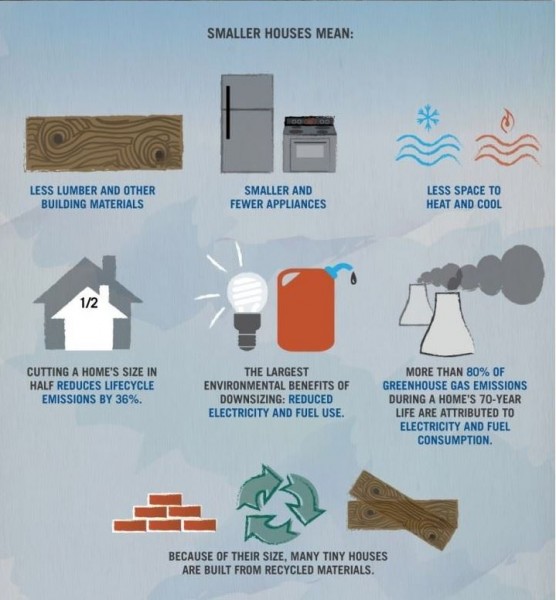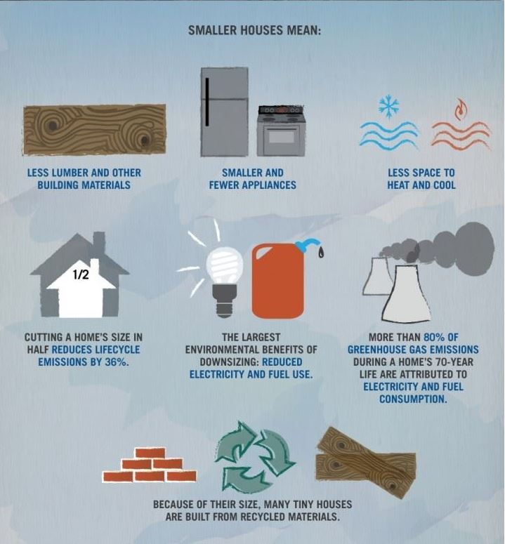 Entre los beneficios ambientales de estas casas está el menor tamaño de las construcciones lo que implica menos espacio a calentar o a enfriar. Se reduce por tanto el consumo de electricidad y de otros combustibles; así como las emisiones derivadas de la construcción de una vivienda de mayor tamaño.