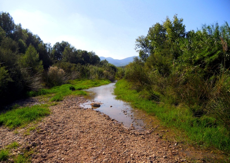 Vegetación de ribera del río Corneros que sufre estrés hídrico por la disminución de caudal en verano y por la extracción de agua para riego. Ribera dominada por juncos, tarays y otras especies adaptadas a la sequía http://www.um.es/