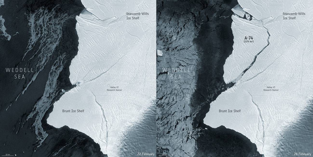 Después de casi una década observando sus grietas, un iceberg gigante con una extensión de 1270 km2 se ha separado el 26 de febrero de la plataforma de hielo Brunt, según han confirmado la British Antarctic Survey y el satélite europeo Sentinel-1. La ruptura se ha producido a menos de 20 km de la estación británica Halley VI, aunque su personal fue evacuado por precaución unos días antes.