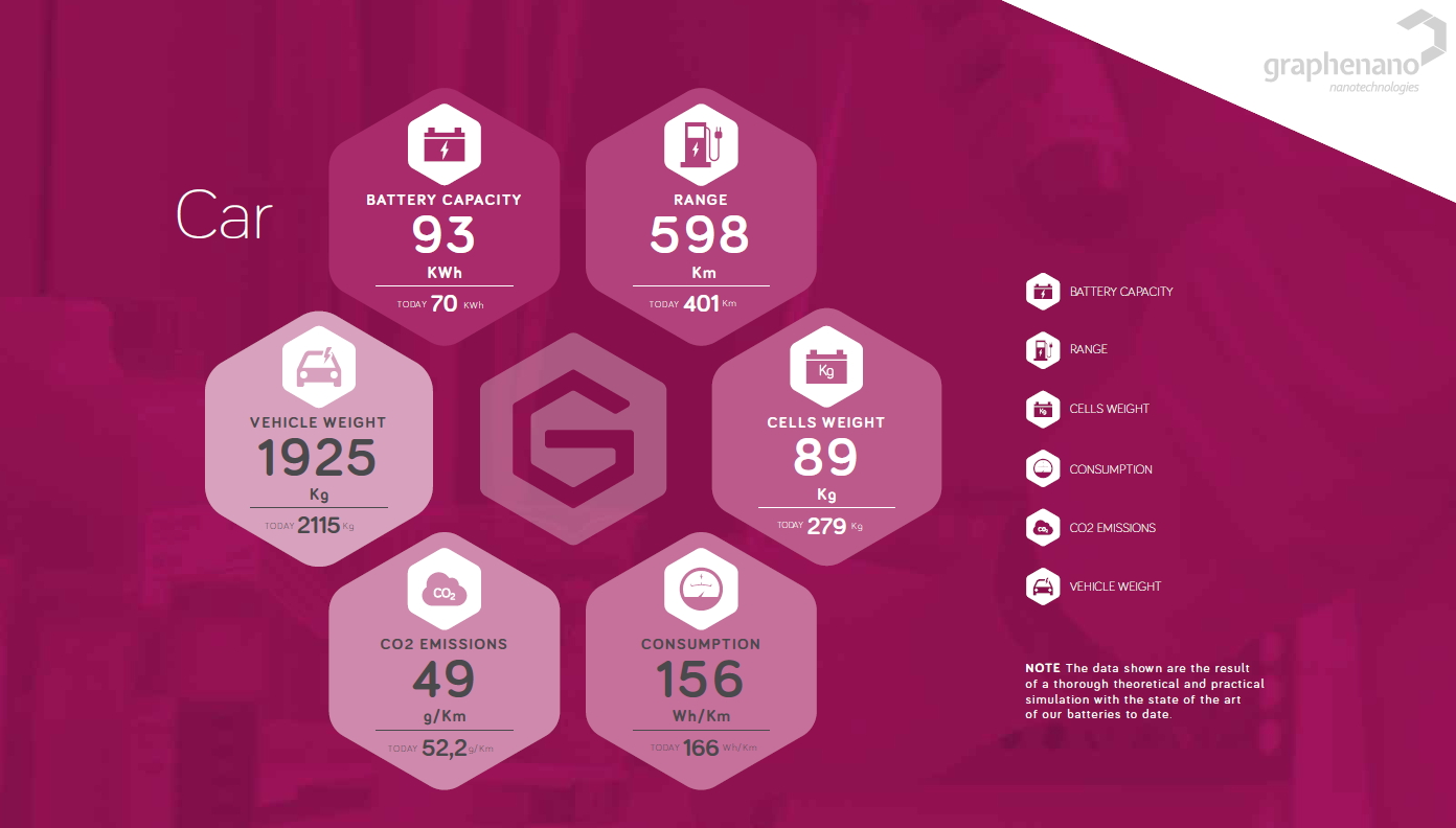 El directivo destacó que la batería de grafeno es modulable, por lo que están trabajando con varios fabricantes de vehículos y de aviones, como Airbus, para que puedan adaptarla a sus productos y fijar la autonomía y la capacidad de carga y recarga que quieren. Del precio señaló que es similar al de una batería de litio, porque lo que interesa es que sea rentable y se pueda comercializar para que suponga la «tercera revolución industrial». Su vida útil es 4 veces superior a la de una de litio y la carga puede ser inductiva.