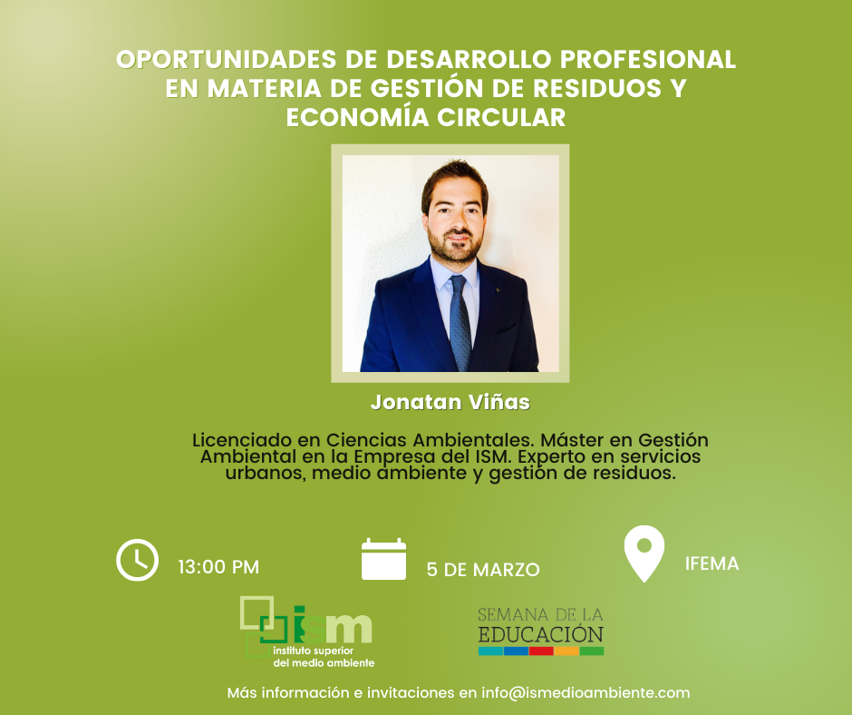 La última de las sesiones que organizamos será el sábado 5 de marzo, en horario de 13:00 a 14:00h llamada «Oportunidades de desarrollo profesional en materia de gestión de residuos y economía circular». Contaremos con Jonatan Viñas, ambientólogo experto en servicios urbanos, Medio Ambiente y gestión de residuos.