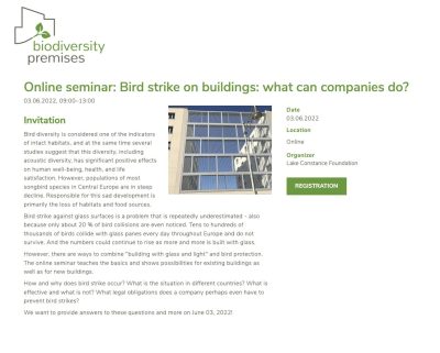 Sin embargo, hay formas de combinar la «construcción con vidrio y luz» y la protección de las aves. Durante el webinario “Bird strike on buildings. What can companies do?” aprenderás los conceptos básicos y expertos de distintas organizaciones mostrarán las posibilidades disponibles tanto para los edificios existentes como para los de nueva construcción.