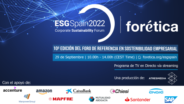 ‘ESG Spain 2022: Corporate Sustainability Forum’ es el evento anual de referencia en sostenibilidad empresarial en España, organizado por Forética. El próximo 29 de septiembre se celebrará la décima edición en un formato innovador: un programa de televisión en directo, retransmitido a través de plataforma digital vía streaming (con la producción de Atresmedia).