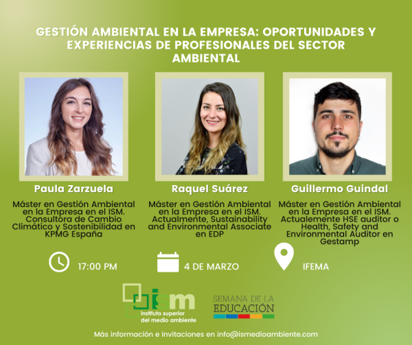 El viernes 4 de marzo, de 17:00h a 20:00h tendrá lugar la sesión “Gestión ambiental en la empresa: oportunidades y experiencias de profesionales del sector ambiental” con la participación de Paula Zarzuela Dosío, Consultor de Cambio Climático y Sostenibilidad en KPMG España; Guillermo Guindal Estévez, HSE auditor o Health, Safety and Environmental Auditor; y Raquel Suárez, Sustainability and Environmental Associate en EDP. Ex alumnos del Máster en Gestión Ambiental en la Empresa del ISM.