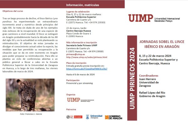Las Jornadas Sobre el Lince Ibérico en Aragón se llevarán a cabo los días 8, 15 y 22 de marzo de 2024, con sesiones en la Escuela Politécnica Superior de la Universidad de Zaragoza en Huesca y una sesión especial el 22 de marzo en el Centro Ibercaja Huesca. Estas jornadas, organizadas por la UIMP, se ofrecerán tanto de manera presencial como por streaming, permitiendo una amplia participación.