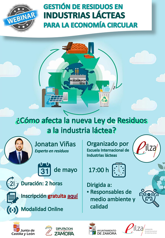 Duración: 2 horas. Modalidad: Online. Organiza: Escuela Internacional de Industrias Lácteas. Imparte: Jonatan Viñas Experto en residuos. Dirigida a: Responsables de medio ambiente y calidad. Programa: 17:00h. Presentaciones. 17:10h. Ponencia parte I: ¿Cómo afecta la nueva ley de residuos a la |