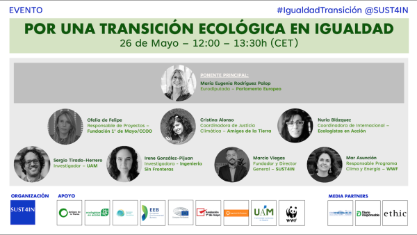 Te invitamos al evento online Por una transición ecológica en igualdad, el 26 de mayo, 12:00 – 13:30 (CET), cuyo objetivo es debatir con activistas y expertas de diferente índole los distintos aspectos de la vinculación entre la igualdad de género y la transición ecológica.