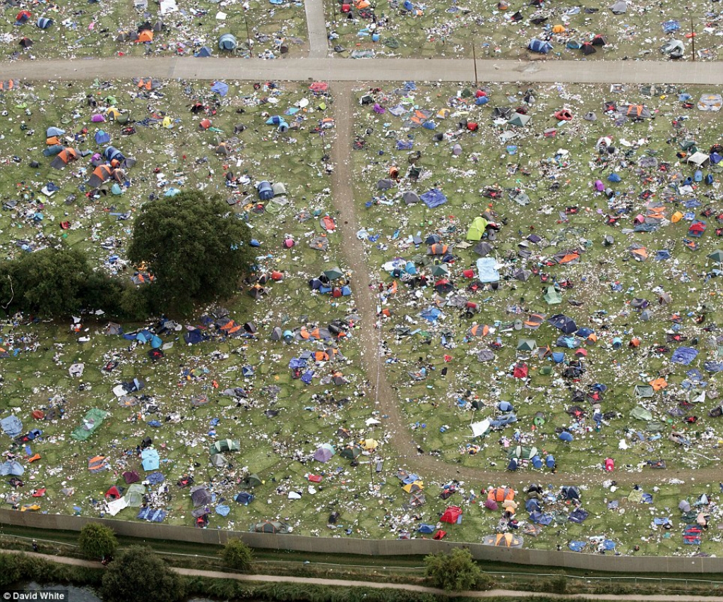 Vista aérea de las tiendas abandonadas tras un festival. Imagen: David White http://smashinglive.com/