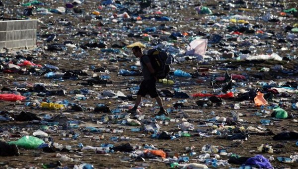 Pero la cosa no queda ahí, además está la ingente cantidad de toneladas de residuos del festival derivados de la intendencia festivalera: platos, botellas, vasos, latas de cerveza, servilletas, condones usados, toallitas, etc. Para que os hagais una idea, 10 grandes festivales (de esos de 100.000 asistentes cada uno), equivalen a 500.000 tiendas de campaña, lo que equivalen a 100.000 tiendas de campañas que se abandonan cada año sólo en esos 10 festivales, que a unos 4 kilogramos por tienda resultan 400 toneladas de basura que, y aquí lo más dramático, no se pueden reciclar. Eso sin contar el coste económico de todas esas tiendas, que estaría entre los 2 y 3 millones de euros tirados literalmente a la basura.