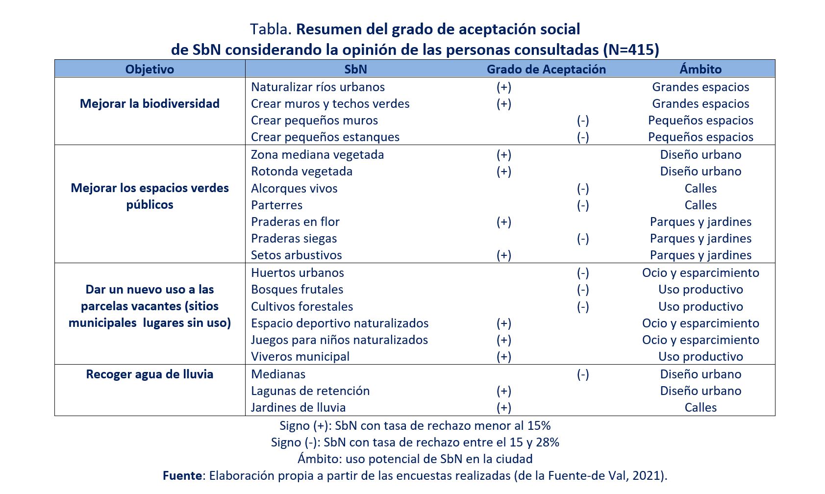 Un estudio, que próximamente será publicado en Ciudad y territorio: Estudios territoriales, muestra que la mayoría de las personas consultadas (72%) valoran de forma positiva acciones de SbN para ser integradas en la planificación urbana. No obstante, este consenso tiene matizaciones; por cuanto las 20 SbN evaluadas poseen distinto grado de aceptación. La tabla muestra con signo (-) aquellas SbN que han recibido entre un 15 y 28% de rechazo. Es decir, los SbN en que los porcentajes de respuesta de indiferente, en desacuerdo y totalmente en desacuerdo suman entre 15 y 28%, lo que puede interpretarse como una opinión negativa hacia su aplicación en el municipio. Cabe indicar, que, en ninguno de los 20 SbN, el rechazo fue mayor que la aceptación social.