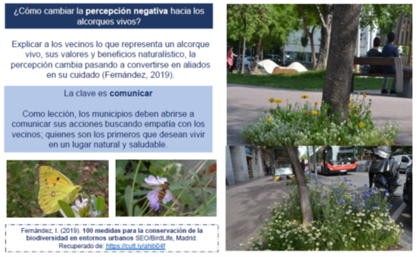 En coherencia con lo anterior, los resultados dejan en evidencia la importancia de transmitir los valores asociados a los SbN reforzando los beneficios que aportan a las ciudades y, a la sociedad en su conjunto. Por ejemplo, es sabido el notable beneficio de los alcorques vivos siguiendo las ideas emergentes de convertir estos “pequeños espacios sin vida” en ecosistemas cubiertos de plantas herbáceas, flores silvestres, etc. Además de atraer insectos polinizadores de todo tipo y controladores de plagas, las mal llamadas “malas hierbas” mejoran la calidad de la tierra del alcorque, y de esta forma el complejo sistema de raíces del árbol. Por ende, su sobrevivencia en un medio tal hostil como el urbano.