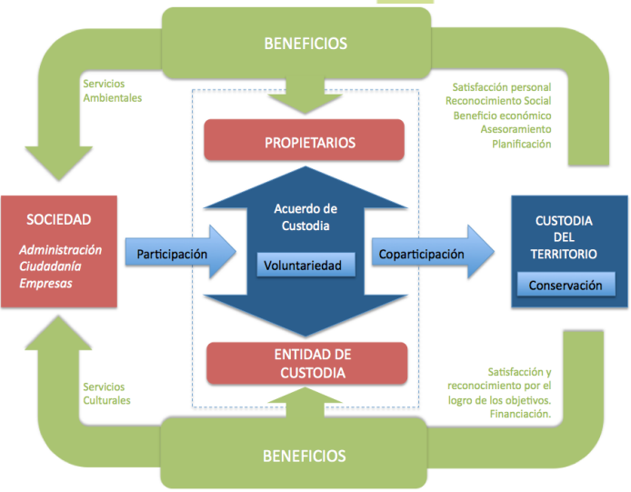 “La custodia del territorio se define como el conjunto de estrategia o técnicas jurídicas a través de las cuales se implica a los propietarios y los usuarios del territorio en la conservación y uso de los valores y los recursos naturales, culturales y paisajísticos”.