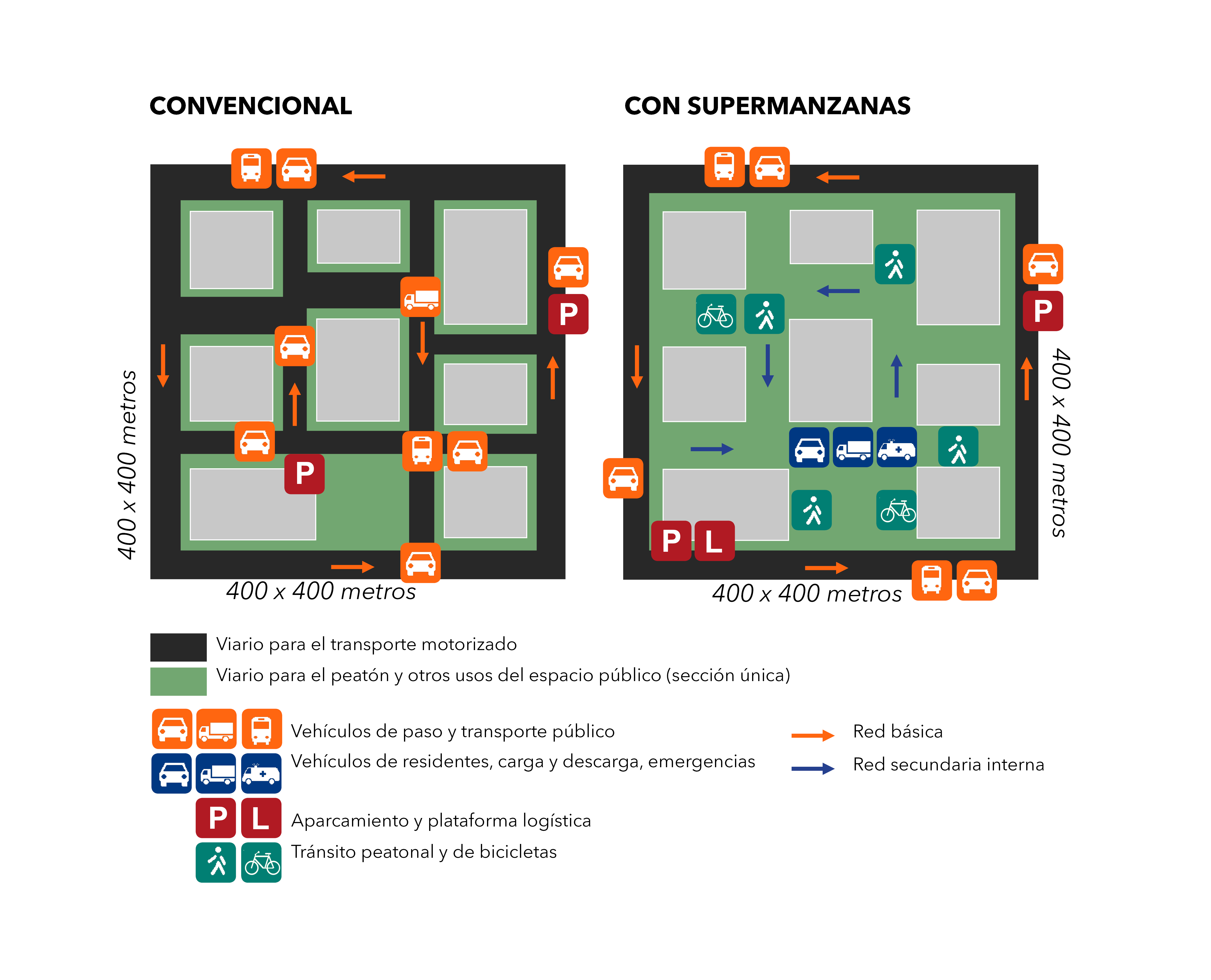La Supermanzana permite, además, ordenar la movilidad de una ciudad entera, ya que funciona como una célula urbana. De esta manera, el tráfico se canaliza por las vías perimetrales de la Supermanzana, que da lugar a redes ortogonales –como la nueva red de autobuses de Barcelona o la de Vitoria-Gasteiz, implementada en 2009-, más eficientes en la distribución de los flujos de movilidad. El interior de las Supermanzanas se mantiene sin vehículos, para el desarrollo de actividades como pasear, charlar, jugar, disfrutar de eventos, de fiestas locales y un largo etcétera.
