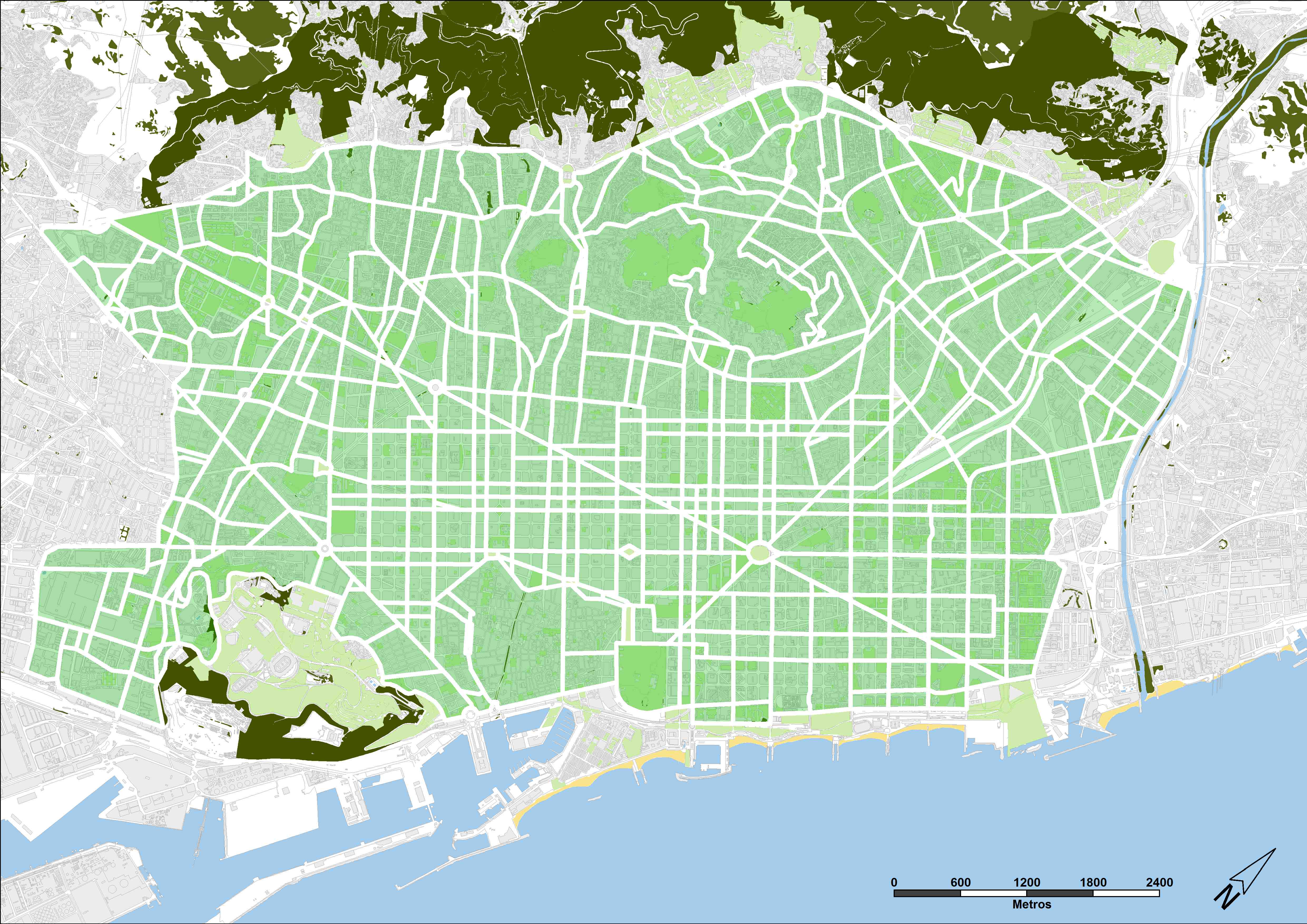 Barcelona estructurada en Supermanzanas (en verde). Por las vías básicas (en blanco), circulan los vehículos motorizados, tanto privados como de transporte público. Fuente: BCNecologia.
