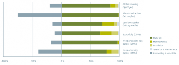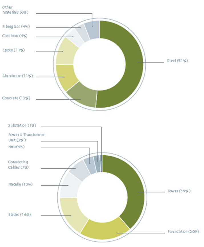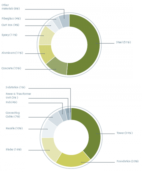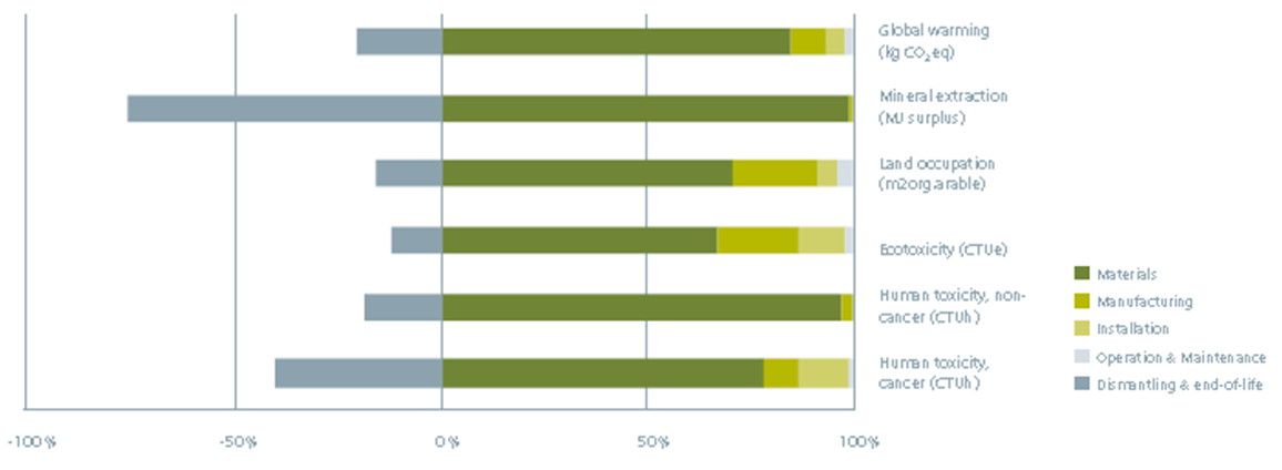 Por ejemplo, debajo mostramos unas gráficas extraídas de la Declaración Ambiental de Producto de un parque eólico de Siemens. En ella podemos ver que: