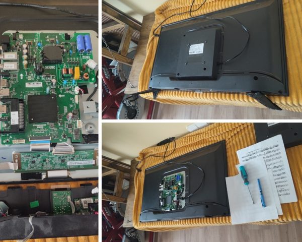 Con todos los ingredientes disponibles en la cocina, tocó arremangarse y volver a desempolvar el destornillador y algo de ingenio para sacar adelante la receta de la sustitución de pantalla. En esta ocasión, tocó retirar algo de tornillería, y me llamó de nuevo la atención de la falta de ecodiseño, era muy palpable y comparable, pues estaba replicando el procedimiento de desmontaje y retirada de la pantalla LCD de dos modelos de televisión diferentes, pero con algunas piezas similares. En el televisor que quería reparar, la placa electrónica de la pantalla LCD únicamente estaba sujeta al chasis por un par de cintas plásticas fáciles de retirar, sin embargo, en el otro televisor, esta misma placa estaba pegada a conciencia con algún tipo de pegamento sobre el propio chasis; aquí vemos diferencias en el diseño del producto, las cuales pueden facilitar o dificultar la reparación del mismo.