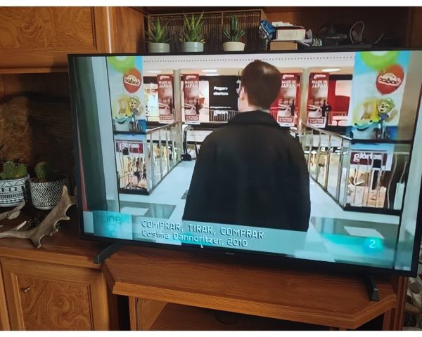 Televisor de sustitución reproduciendo el documental denominado “Comprar, tirar, comprar”, dirigido por Cosima Dannoritzer, donde aborda diversas aristas sobre la obsolescencia programada. Fuente: Propia.