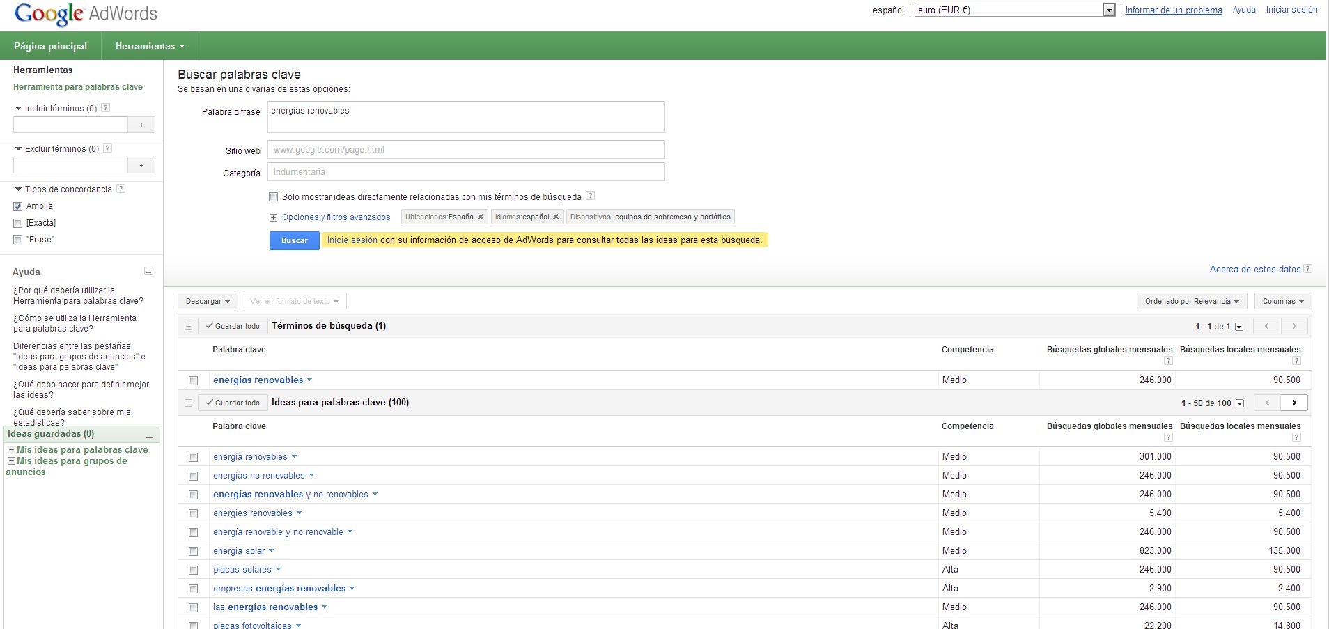 Con la Herramienta para palabras clave de Google Adwords obtendremos las palabras clave que generan más tráfico hacia las webs de nuestro sector (vamos a suponer que somos una consultoría