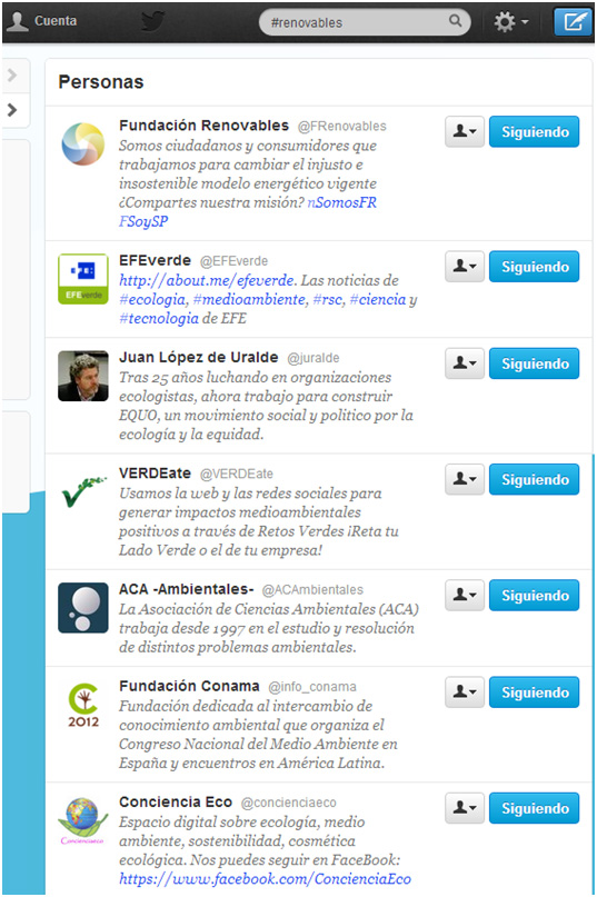 Una simple búsqueda en Twitter de nuestra principal palabra clave (o de su hashtag más habitual) nos dará una lista de usuarios influyentes