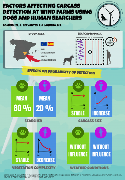 En Factors affecting carcass detection at wind farms using dogs and human searchers, los autores han demostrado que la utilización de perros convenientemente adiestrados es una herramienta sustancialmente más efectiva que los buscadores humanos para la caracterización del impacto de la energía eólica sobre la fauna. Los perros obtuvieron tasas de éxito muy elevadas en todas las condiciones ambientales analizadas, pero fueron especialmente efectivos en situaciones de vegetación estructuralmente compleja y densa y con las especies de menor tamaño. Mientras que los humanos solo obtuvieron un éxito aceptable cuando el entorno estaba muy despejado y el objetivo fueron las especies de mayor envergadura.