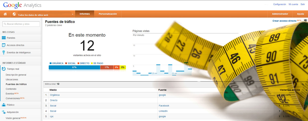 Google Analytics mejora día a día su experiencia de usuario, haciendo más sencilla la labor de obtención de datos y configuración de patrones de seguimiento. Entre sus últimas actualizaciones me gustaría destacar el informe de “Tiempo real”, este informe te facilita minuto a minuto las visitas que están interactuando en tu web, permite saber a través de dónde han llegado, qué están visitando, en qué ubicación física se encuentran etc.