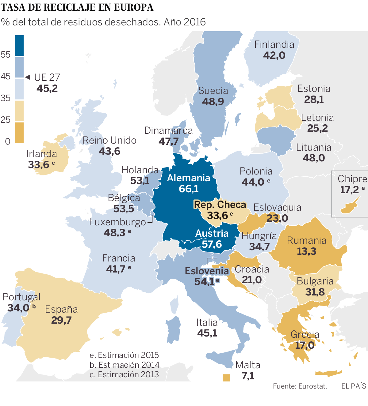En el año 2019, la tasa de reciclaje de residuos sólidos urbanos en España fue del 33,90%, lo cual nos evidencia que estamos relativamente distanciados de la media europea la consideramos en un 45% (Eurosat 2016) y teniendo en cuenta que este dato es de 2016 por lo que la media real de la EU en 2019 podrá estar por encima del 50%. Pero lo más preocupante es la cifra del 55% que exige la normativa europea para 2025, que parece realmente inalcanzable para España.
