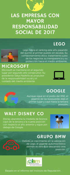 El Instituto de Reputación con base en Boston publica anualmente el listado de las empresas a nivel mundial con la mejor Responsabilidad Social Empresarial tomando como estudio 170.000 empresas, a continuación se muestran las que ocupan los primeros puestos: