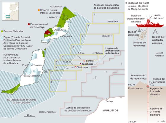 Curiosamente el MAGRAMA iniciaba el 9 de septiembre de 2014 la consulta pública de la propuesta del LIC “Espacio marino del oriente y sur de Lanzarote-Fuerteventura” para la protección del espacio marino del oriente y el sur de las islas de Lanzarote y Fuerteventura, después de la autorización concedida a Repsol. Casualmente este espacio es el que podría verse afectado por un derrame en las investigaciones realizadas cerca de las Islas Canarias.