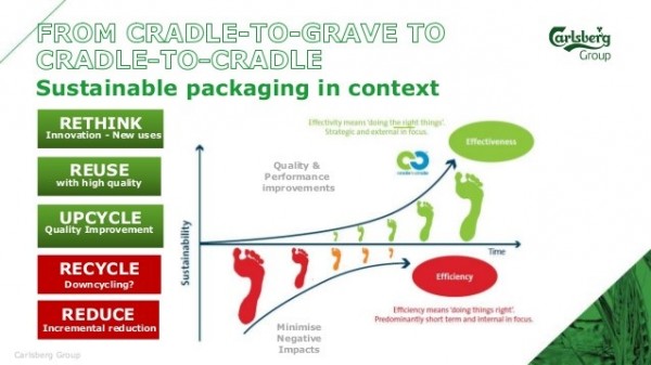 A continuación, se muestra un esquema del fabricante de cervezas Carlsberg, que aplica los principios de la economía circular en su negocio y distingue claramente entre: el enfoque tradicional de eficiencia en la reducción y reciclado de sus envases (downcycling), que es la parte roja en la mitad inferior del esquema; y el de eficacia (en la parte verde de la mitad superior del esquema), en que se ecodiseñan los envases para conseguir el upcycling (conservar el valor de los materiales todo lo posible, a lo largo de todo el ciclo de vida), se plantea la reutilización y se trabaja en repensar nuevas formas de desarrollar su actividad.