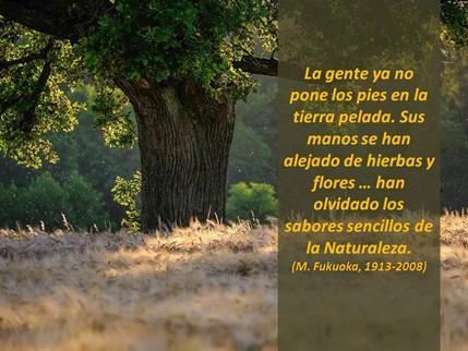 En ese orden de circunstancias es pertinente recordar las palabras de M. Fukuoka, (1913-2008) agricultor y filósofo japonés: “La gente ya no pone los pies en la tierra pelada. Sus manos se han alejado de hierbas y flores, no dirigen su mirada al Cielo, sus oídos están sordos al canto de los pájaros, su nariz se ha hecho insensible a causa de los humos de los tubos de escape y su lengua y su paladar han olvidado los sabores sencillos de la Naturaleza. Los cinco sentidos han crecido aislados del orden natural. La gente se ha alejado dos o tres escalones del hombre verdadero”.
