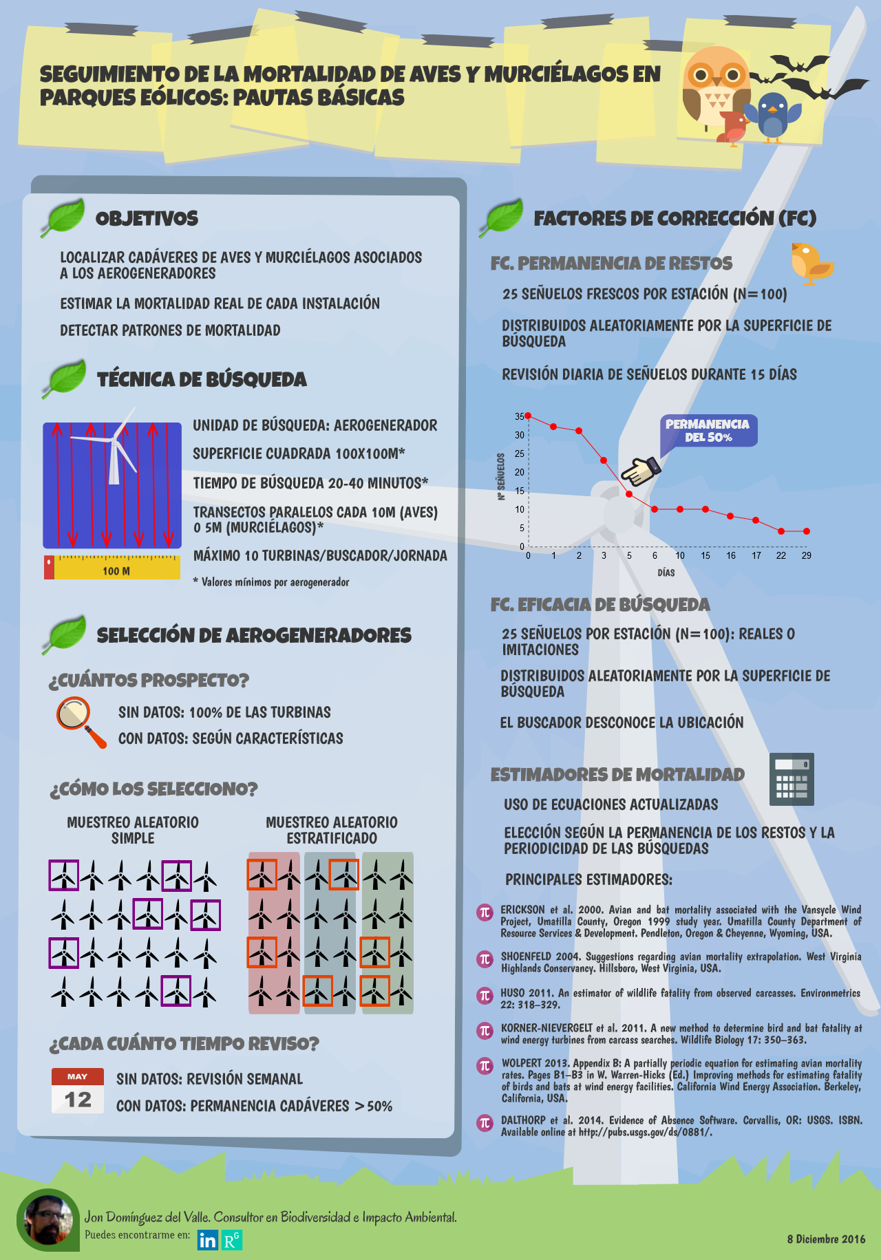 Infografía que resume las directrices principales para realizar un control de mínimos de la mortalidad de aves y murciélagos en instalaciones eólicas industriales.