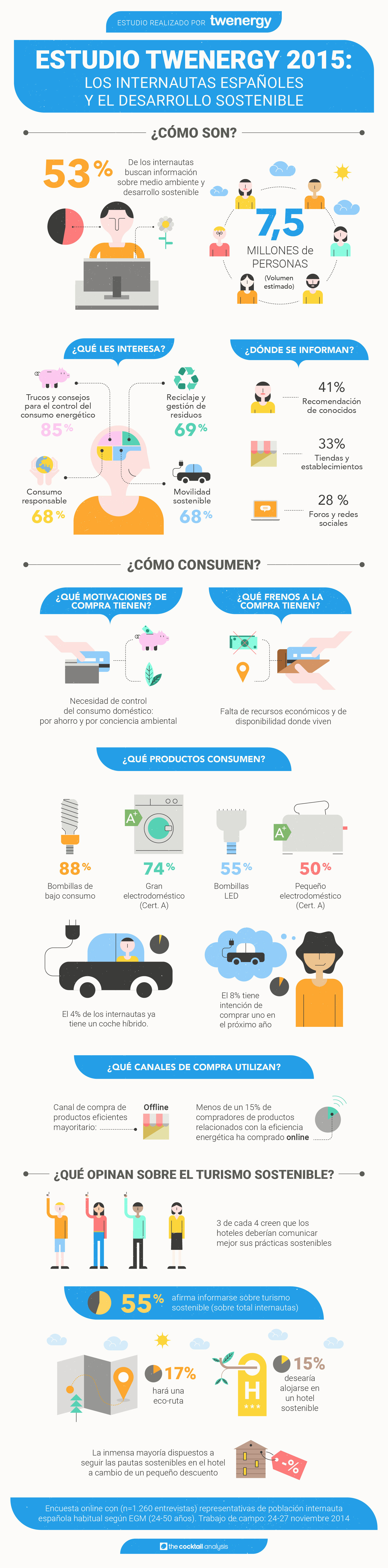 Twenergy ha realizado un estudio junto con la consultora The Cocktail Analysis sobre el comportamiento de los internautas españoles en el territorio de la sostenibilidad. ¿sabías que el 53% de los internautas busca información sobre medio ambiente y desarrollo sostenible? ¿o que el 4% ya tiene un coche híbrido y el 8% tiene intención de comprar uno el año que viene?