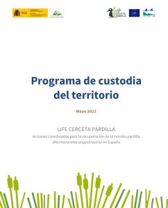 El presente documento constituye un entregable correspondiente a la Acción C6 “Acuerdos/Convenios de colaboración para la conservación de la especie”, en el marco de las acciones de conservación del proyecto “LIFE Cerceta Pardilla” (LIFE19/NAT/ES/000906). El programa presenta una primera parte en la que se exponen los principios básicos de la custodia del territorio (CdT) y se recopilan una serie de casos exitosos de empleo de esta figura en nuestro país para la conservación de zonas húmedas y de las especies que en ellas habitan. A continuación, se analizan los distintos tipos de propiedad que pueden presentar los espacios susceptibles de sustentar acuerdos y las principales características de las entidades de CdT. Posteriormente, el programa se centra en las áreas de interés para la cerceta pardilla, analizando diferentes parámetros para poder valorar el potencial de cada área para el uso de la CdT en el marco del proyecto LIFE Cerceta Pardilla. Finalmente, se proponen una serie de actuaciones para realizar en los espacios custodiados. Los anexos incluyen una plantilla de ficha para registrar la información de cada propiedad contemplada para establecer acuerdos de CdT y ejemplos de acuerdos tipo en fincas de diferentes características.