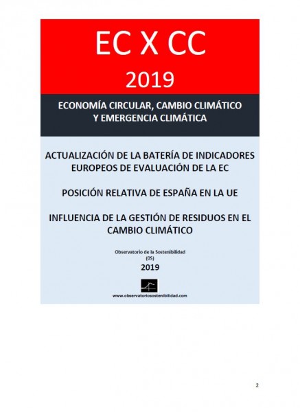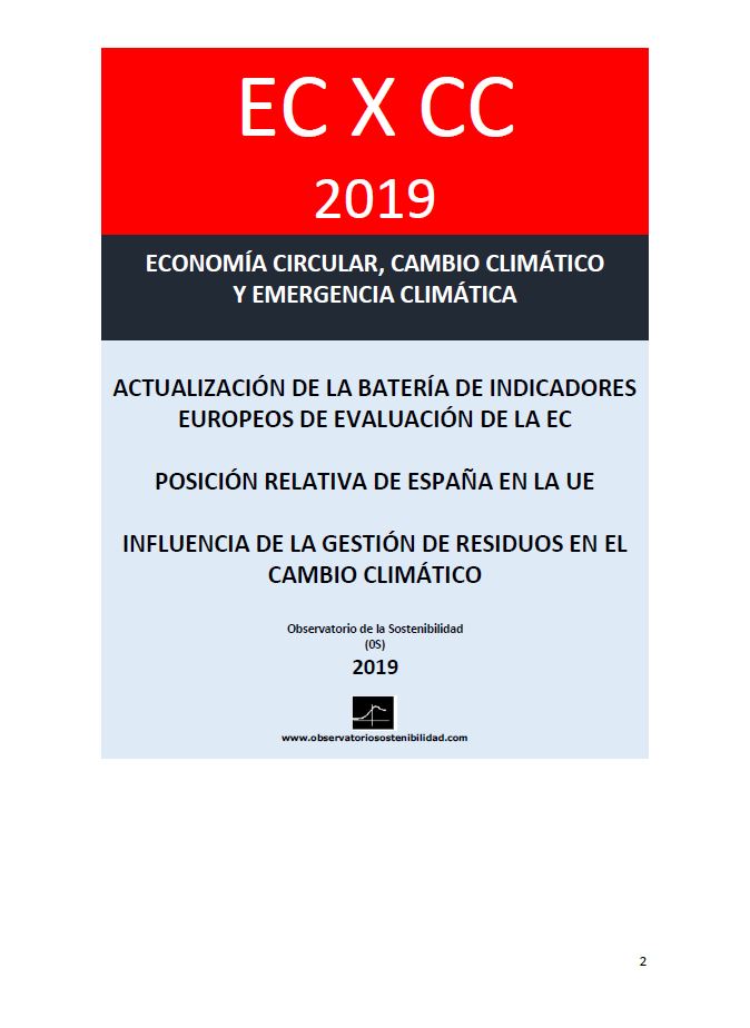 Con motivo de la celebración de la COP25 sobre el CLIMA, el OS publica el informe EC X CC 2019 sobre ECONOMÍA CIRCULAR Y CAMBIO CLIMÁTICO, un resumen sobre el desempeño de España en Economía Circular en la UE a través del análisis cuantitativo de los indicadores seleccionados por la Comisión Europea (EUROSTAT) para medir el desarrollo de la EC en Europa, y sobre las repercusiones de la gestión de residuos en el Cambio Climático.