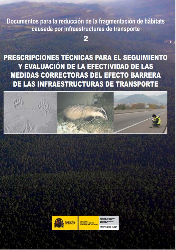 Dentro de la serie Documentos para la reducción de la fragmentación de hábitats causada por infraestructuras de transporte, encontramos la publicación Prescripciones técnicas para el seguimiento y evaluación de la efectividad de las medidas correctoras del efecto barrera de las infraestructuras de transporte. Aborda lo relativo a los programas de vigilancia ambiental, dando recomendaciones concretas sobre métodos y procedimientos de evaluación y seguimiento en las fases de proyecto, construcción y funcionamiento de las infraestructuras viarias.