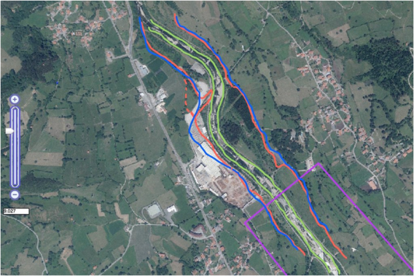 En la misma se aprecia en rojo el cauce real en 1956, en azul el cauce real en 1985, y en verde el cauce artificial en 2014.