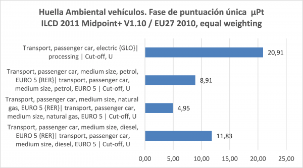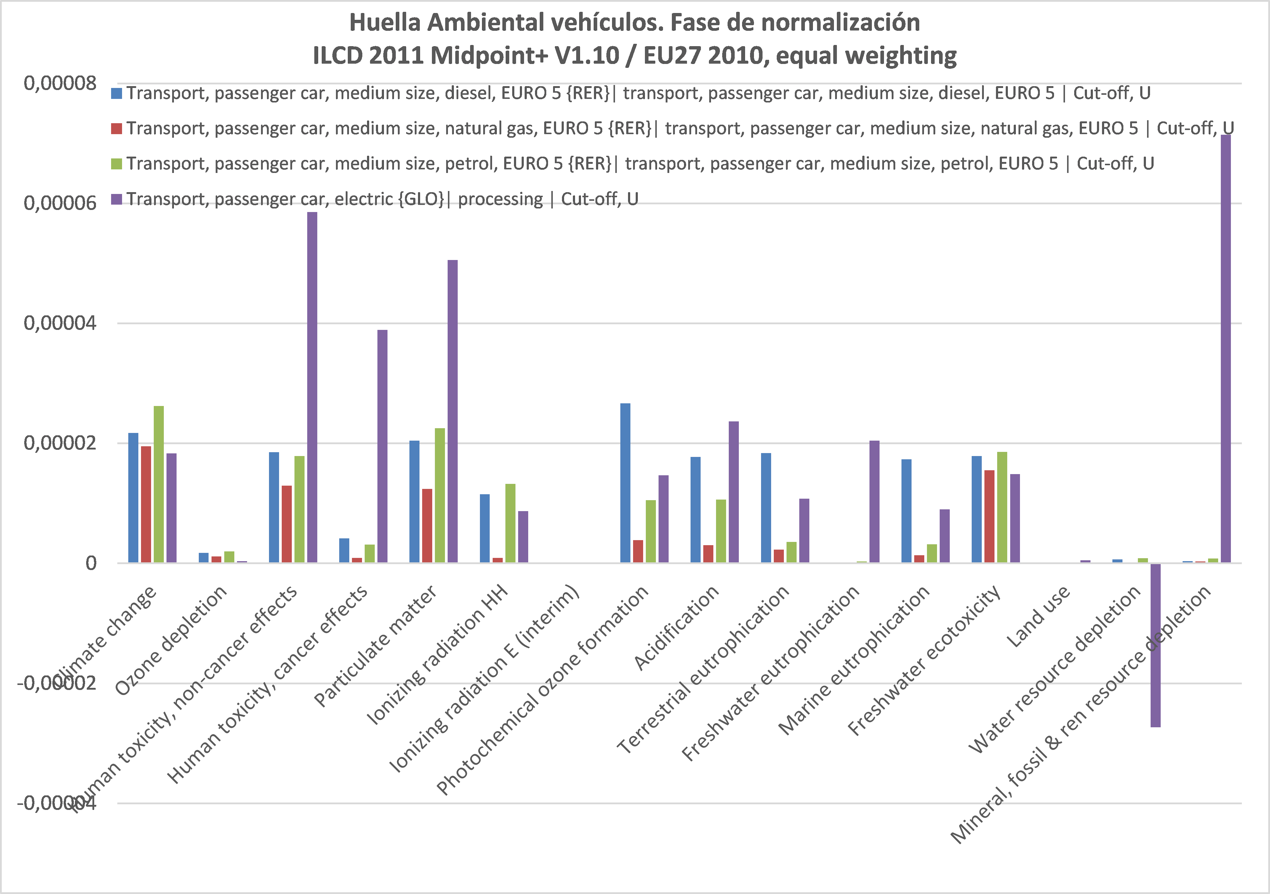 A continuación, presentamos los resultados que obtenemos en la evaluación de impactos, para vehículos Euro 5 (en la base de datos no tenemos disponibles Euro 6, que darían resultados más favorables para los motores de combustión), en las fases de normalización y puntuación única. Se trata de una comparación realizada con procesos promedio disponibles en una base de datos de reconocido prestigio (Ecoinvent).