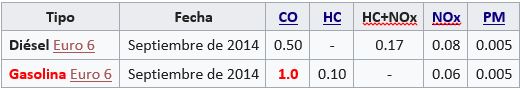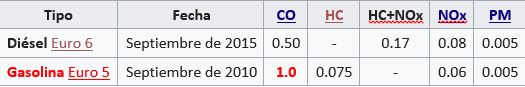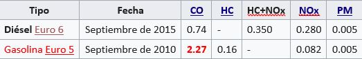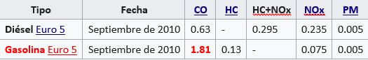 Por tanto, en los vehículos más modernos legislados en la Unión Europea: los vehículos de gasolina pueden emitir el doble o más de CO que los diéseles; en materia de HC y NOx, la cantidad total que pueden emitir los vehículos diésel es muy parecida a la que pueden emitir los de gasolina; y el límite para partículas es el mismo.